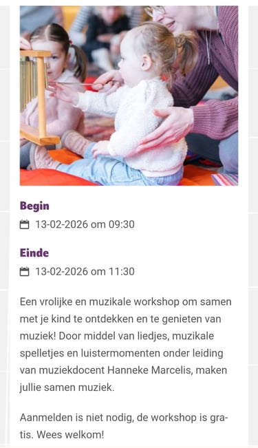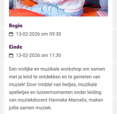 Samen met uw/jouw (klein)kind genieten van muziek! Samen beleven van muziek door zingen, bewegen, luisteren naar muziek, muzikale spelletjes en het bespelen van (kleine) muziekinstrumentjes.